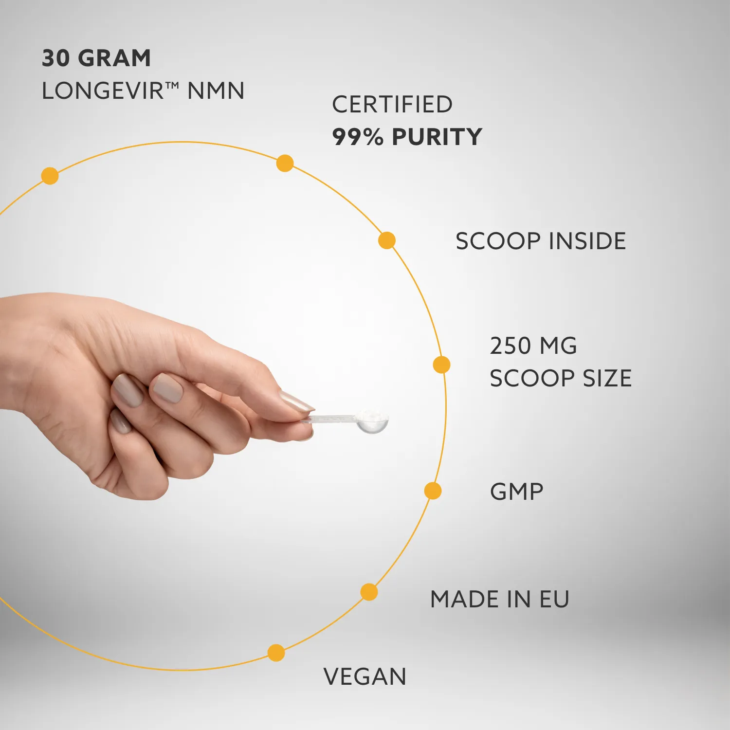 Con polvo de NMN fabricado en Europa con un 99% de purezaPurovitalis ofrece calidad superior y total transparencia, dándote un control total sobre tu dosis y tu rutina.