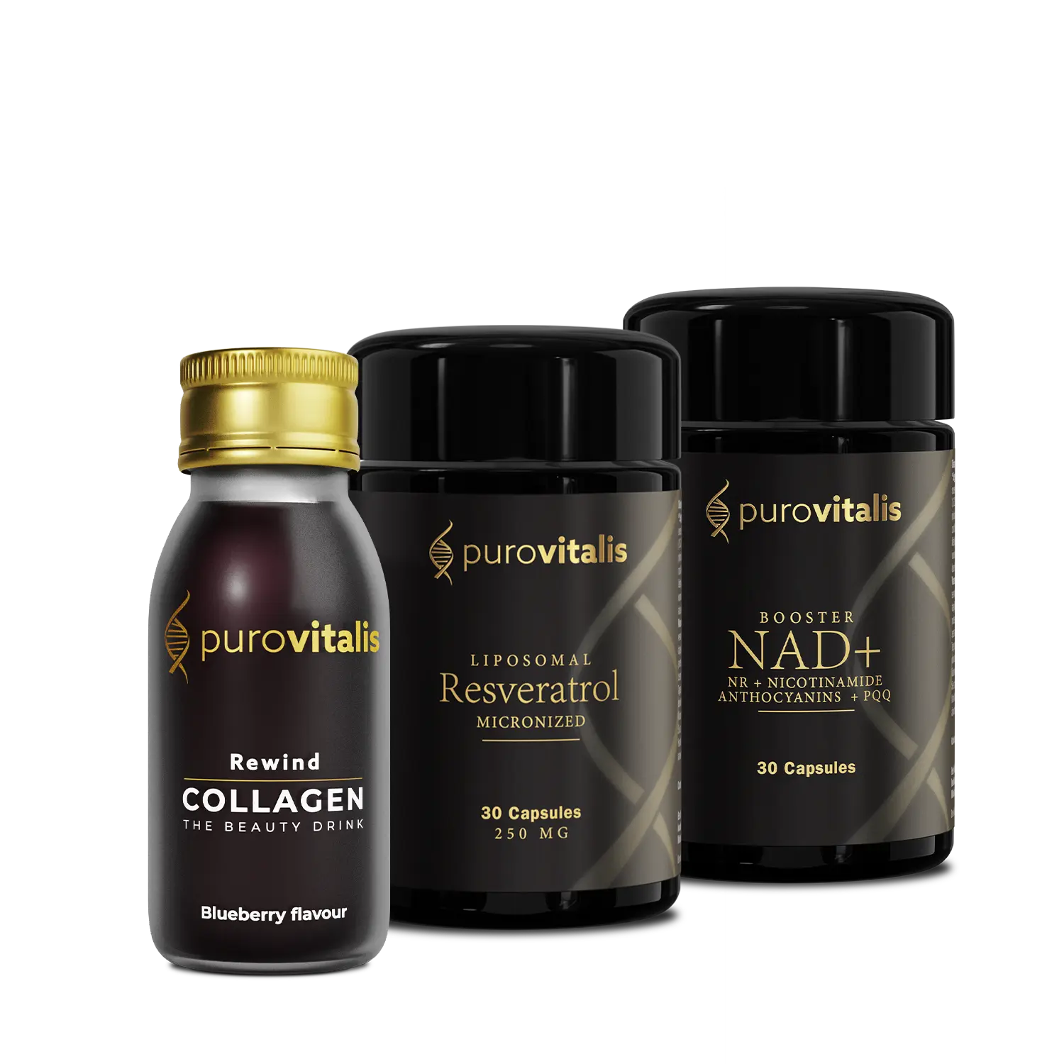 Collagene in acqua o in un frullato una volta al giorno; NAD⁺ Booster a colazione; Resveratrolo con il pasto principale. Consulta la sezione "Modalità d'uso" qui sopra e segui ogni etichetta.