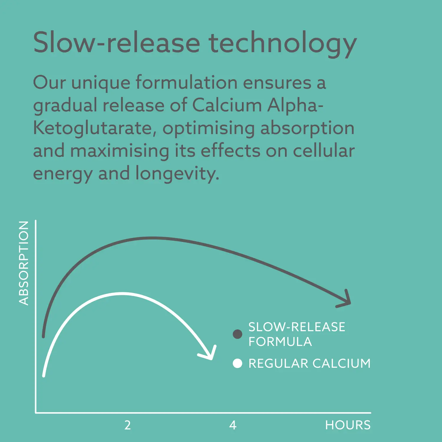La nostra tecnologia brevettata a lento rilascio nelle compresse di Calcio AKG, progettata per offrire benefici sostenuti per tutto il giorno. La nostra formulazione unica assicura un rilascio graduale di Calcio alfa-chetoglutarato, ottimizzando l'assorbimento e massimizzando i suoi effetti sull'energia cellulare e sulla longevità.
