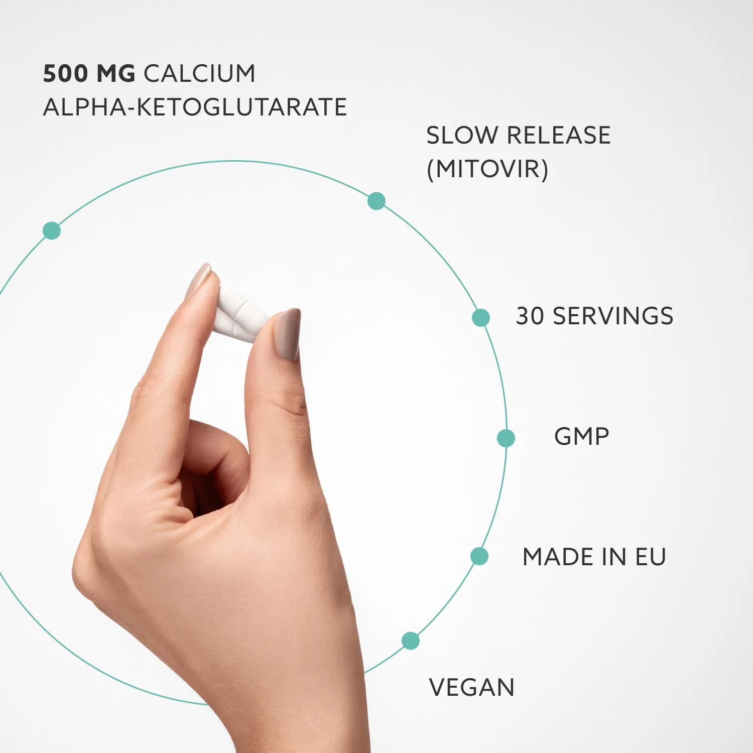 Il calcio alfa-chetoglutarato (Ca-AKG) è un composto naturale che supporta la funzione mitocondriale e la produzione di energia. Le ricerche suggeriscono che svolge un ruolo chiave nella forza e nella longevità delle ossa.