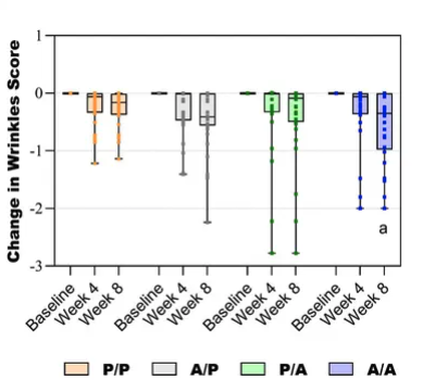 Allo stesso modo, il grafico mostra come cambiano i punteggi delle rughe nel tempo nei quattro gruppi. Dopo quattro settimane si notano piccoli cambiamenti che si sovrappongono, mentre alla settimana otto si vedono differenze più evidenti. Il gruppo che ha preso resveratrolo sia per via orale che topica (A/A) ha mostrato la riduzione più evidente dei punteggi delle rughe rispetto al gruppo placebo (P/P).