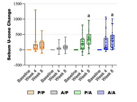 La figura mostra come cambia il sebo nella zona U nel tempo nei quattro gruppi. Si nota un aumento del sebo soprattutto nei gruppi che usano la crema al resveratrolo, con il picco più alto nel gruppo che usa sia la crema che il farmaco orale (A/A) alla settimana otto. Si vedono cambiamenti più piccoli nel gruppo che usa solo il farmaco orale (A/P), mentre il gruppo placebo ha variazioni minime.