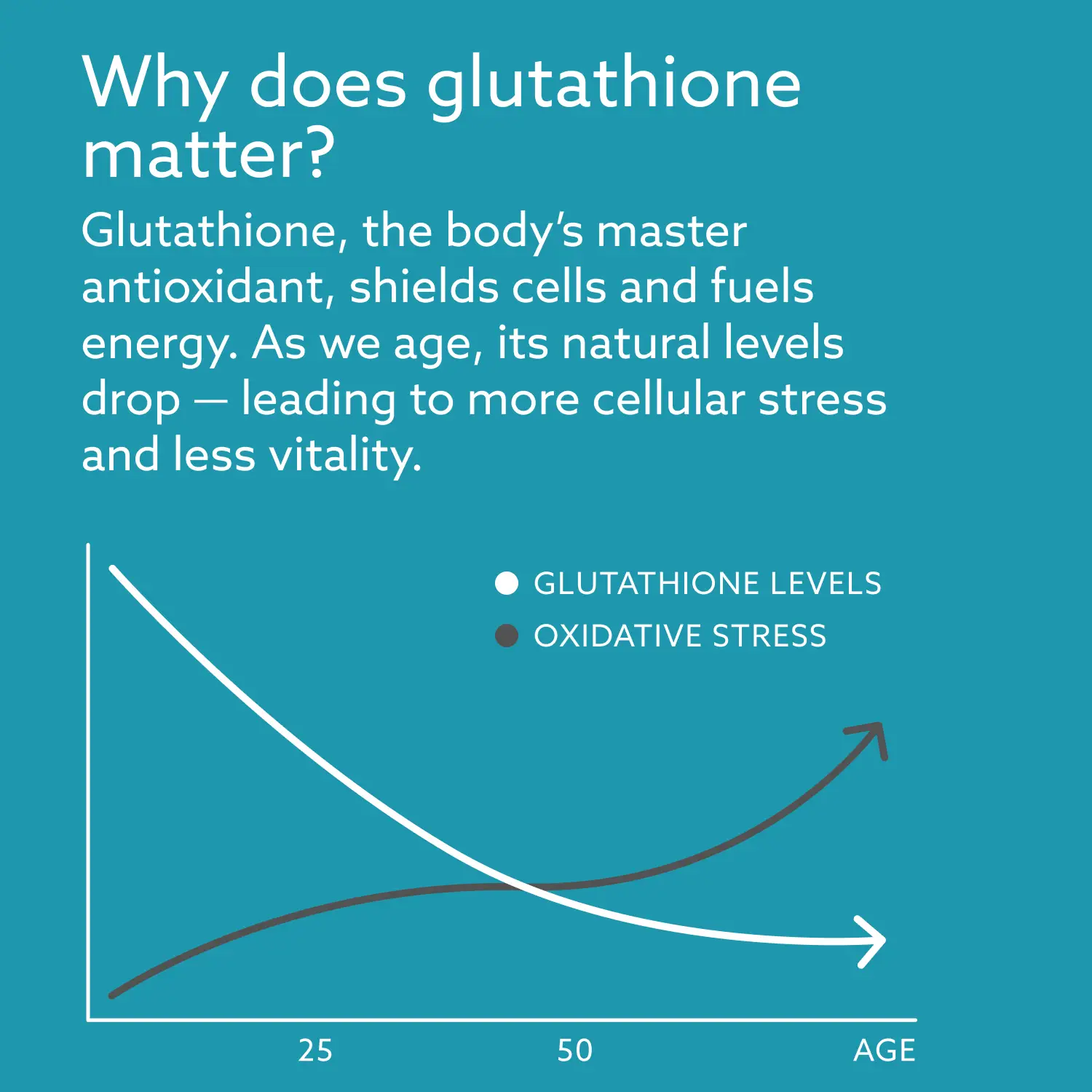 As we age, levels of glutathione — the body’s master antioxidant — decline. This leads to oxidative stress, mitochondrial dysfunction, and cellular imbalance, which in turn contribute to fatigue, cognitive decline, and faster aging.