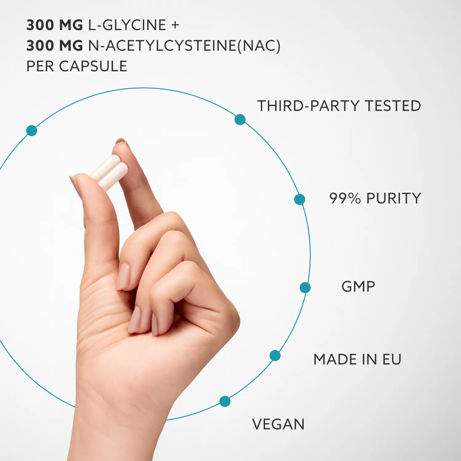L-Glycine, N-Acetyl Cysteine, Microcrystalline cellulose, Hydroxypropyl methylcellulose (vegan capsule)