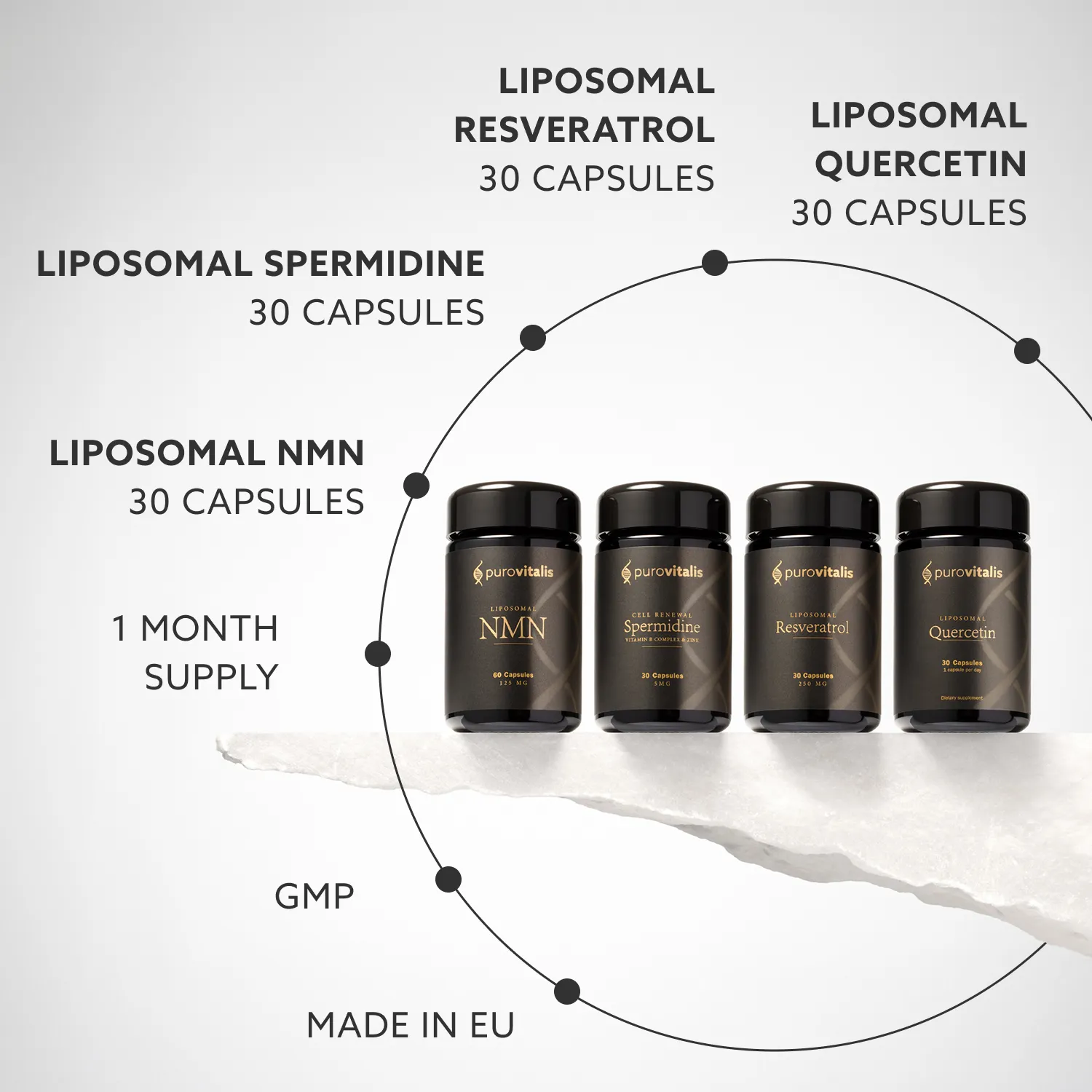 Contains: 30 capsules of Resveratro, Quercetin and Spermidine + 60 capsules of Liposomal NMN