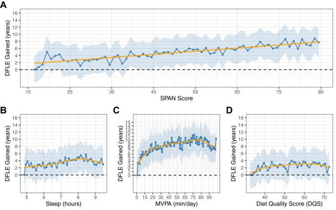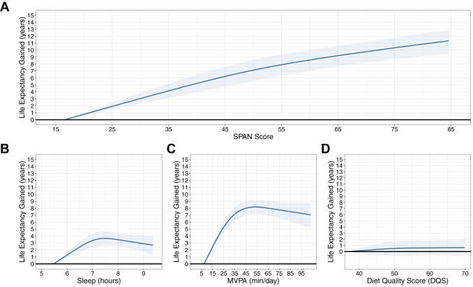 Figure from the study illustrating the association between sleep, physical activity (MVPA), and diet quality and life expectancy. Panel A shows the combined SPAN effect, while panels B–D show the individual associations.